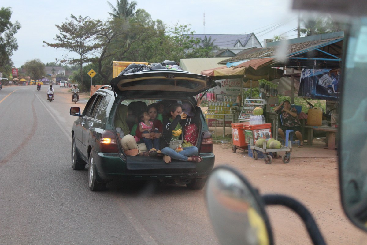 Сначала было ощущение, что нам просто не хватит места на всех. Но потом половину людей высадили у границы и посадили нас — хитрый кхмерский ход: много людей — убери половину, хорошо хоть не дедовскими методами. Мест в итоге хватило, а на пару свободных водила постоянно подбирал попутчиков. Вообще, первую половину пути было ощущение, что он только и занимается тем, что собирает попутчиков. Одной рукой звонит, второй роется в телефоне, третьей скорости переключает, а четвертой крутит руль. Еще и песенки поет в процессе.